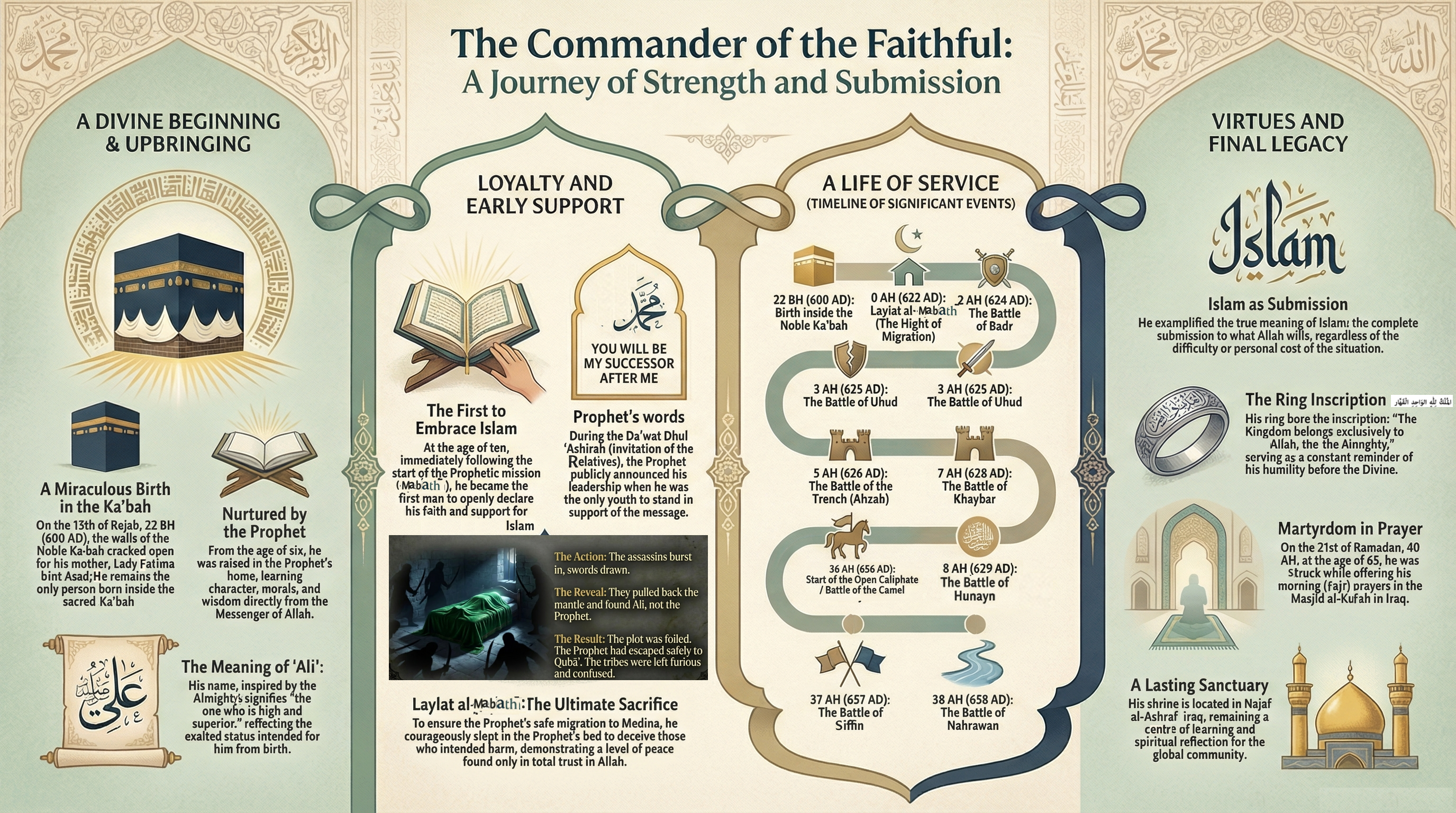 This lesson explores the life, spiritual importance, and ultimate sacrifice of Imām ʿAlī ibn Abī Ṭālib, emphasizing his distinctive role as the first Imām and the successor to Prophet Muḥammad.