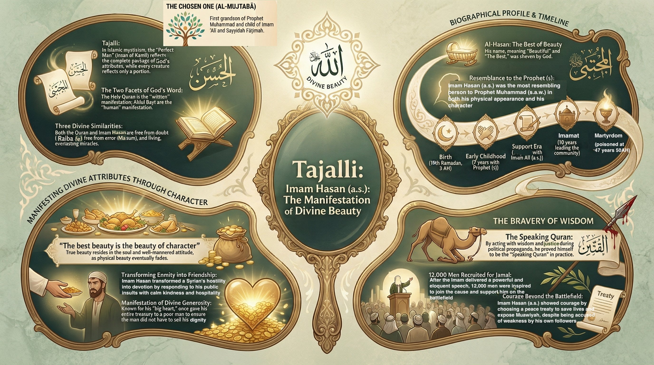 This lesson will discuss Imam Hasan (a.s.) as the "Manifestation of Divine Beauty" and the "speaking Quran". Beyond his physical resemblance to the Prophet (SAW), he manifested the "beauty of character" by repelling evil with good, transforming enemies into friends, and exercising the supreme courage of wisdom to sign a peace treaty that preserved the Muslim nation. Homework: Do not forget to complete pages 333, 334, 335 from Book 7.